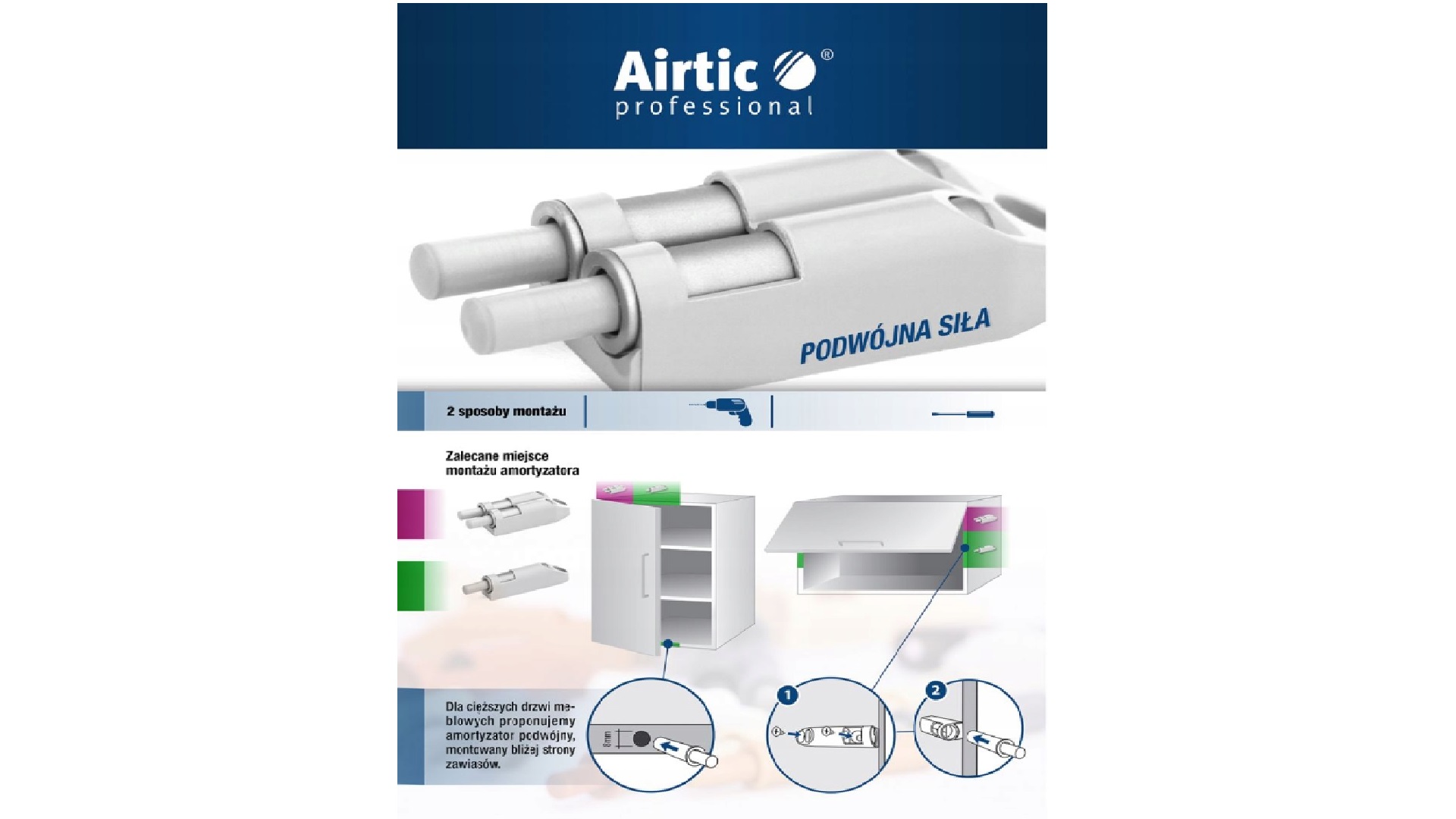 Jego pneumatyczna budowa pozwala na ciche i delikatne zamykanie szafek meblowych. Można go zamontować w ciągu kilku sekund w dowolnym miejscu mebla.