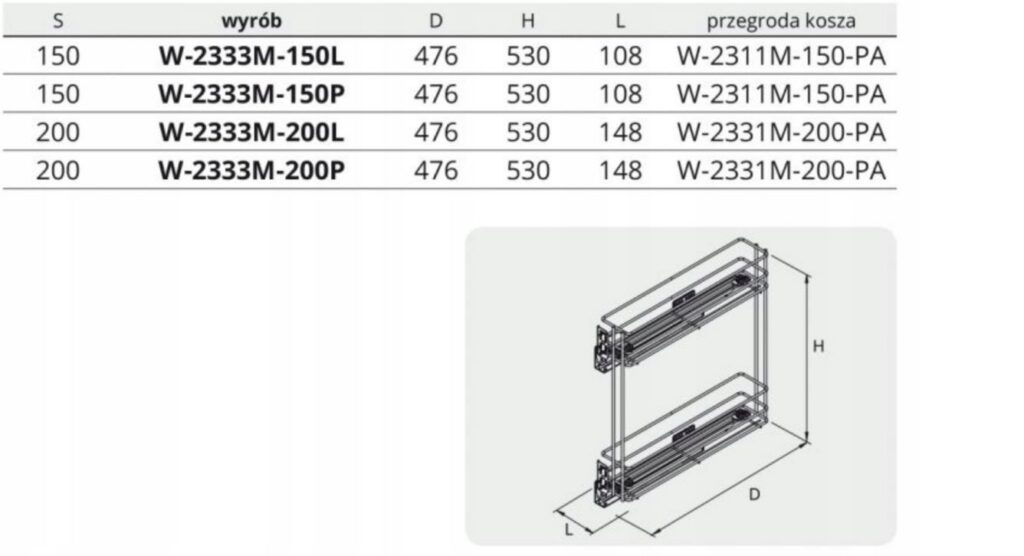 - Zastosowanie: do szafki o szerokości zewnętrznej 150mm ( przy zastosowaniu płyty o grubości 18mm)