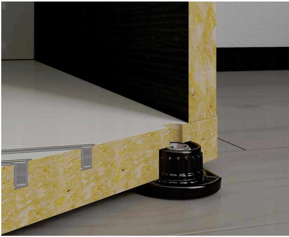 Odpowiednie do stosowania w ciężkich szafach, regałach i meblach modułowych. ► Stworzone z myślą o meblach z mocno obciążonym dnem. ► Do zainstalowania w wieńcu dolnym. ► Regulacja jest możliwa przez otwór Ø 8 w wieńcu dolnym, przy użyciu klucza imbusowego S6 lub przy pomocy śrubokręta. ► Metalowa nóżka z niezależnym plastikowym ślizgiem, ułatwiającym regulację oraz zapobiegającym porysowaniu podłogi. ► Plastikowa zaślepka do zamaskowania otworu regulacyjnego wewnątrz mebla. ► Regulacja: 7-17 mm. ► Obciążenie 175 kg/szt. ► Testowane zgodnie z wymaganiami włoskiego instytutu CATAS.