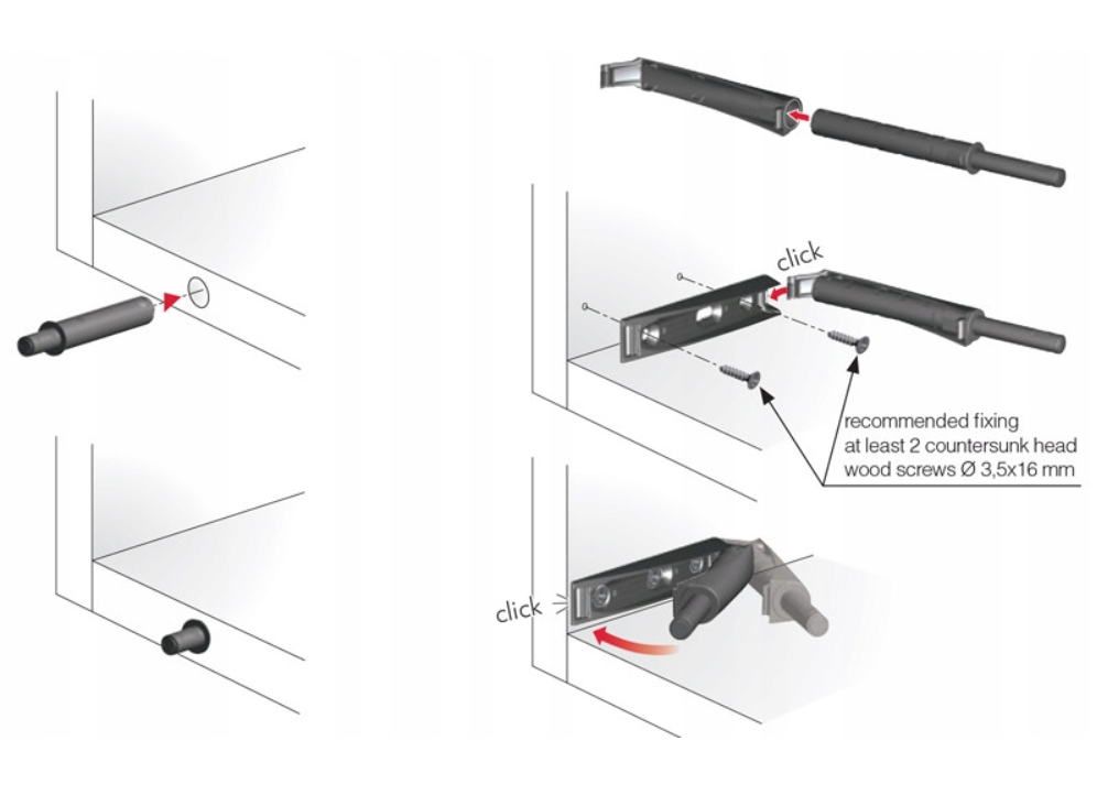- Do odbojnika należy dokupić dodatkowo Płytka samoprzylepna K-Push Tech lub Płytka montażowa na wkręt K-Push Tech