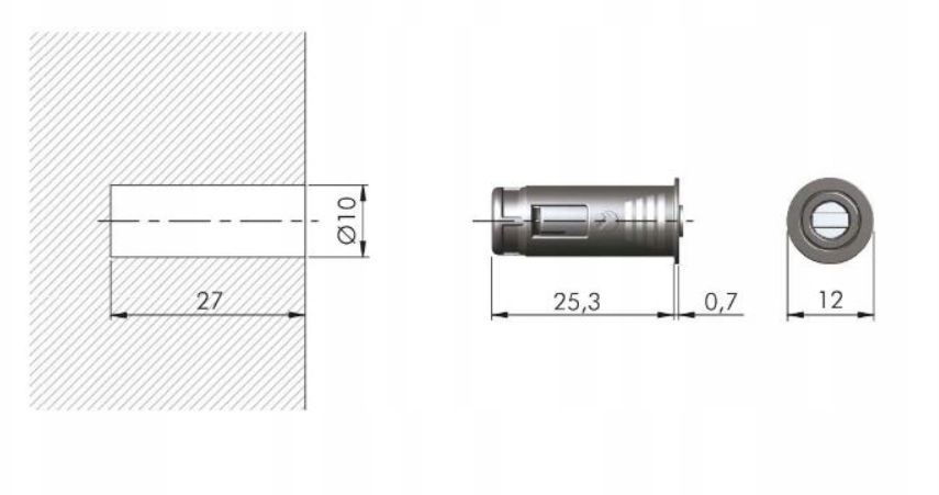 Trzpień z magnesem należy zamontować w korpusie szafki. Montaż polega na wyfrezowaniu lub wywierceniu otworu o średnicy 10 mm