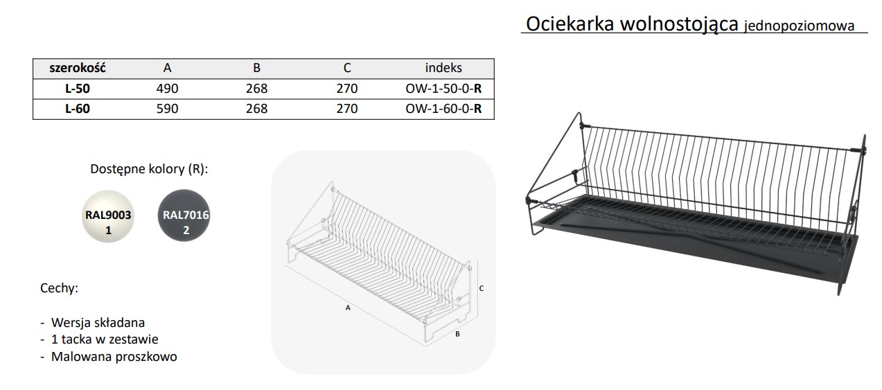 Ociekarka wolnostojąca jednopoziomowa L-50 w kolorze antracytowym to inteligentne rozwiązanie, które doskonale łączy zarówno praktyczność, jak i styl. Jej wymiary zostały starannie zaprojektowane, aby zapewnić maksymalną wydajność suszenia naczyń, jednocześnie zachowując kompaktowy design.