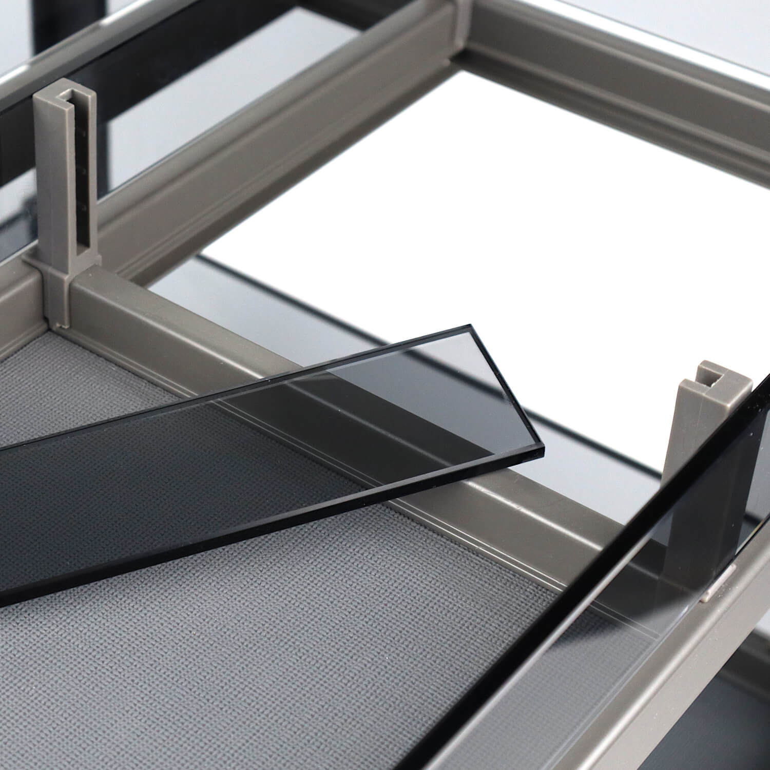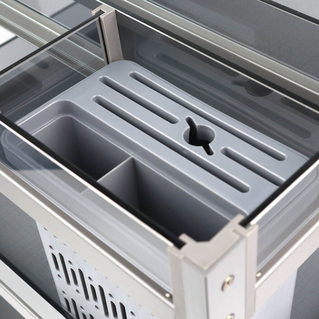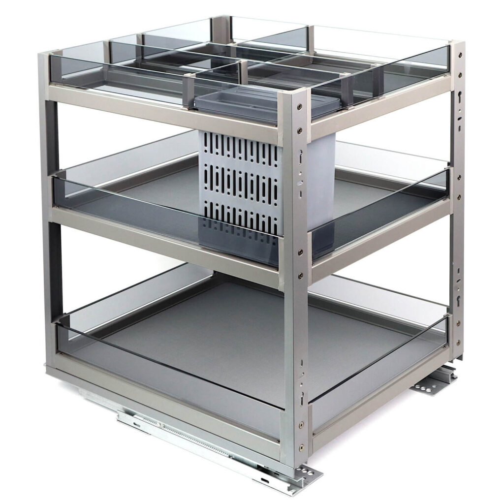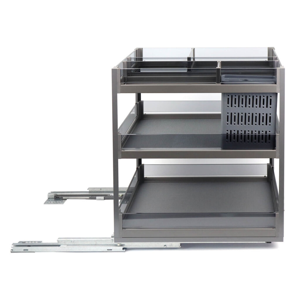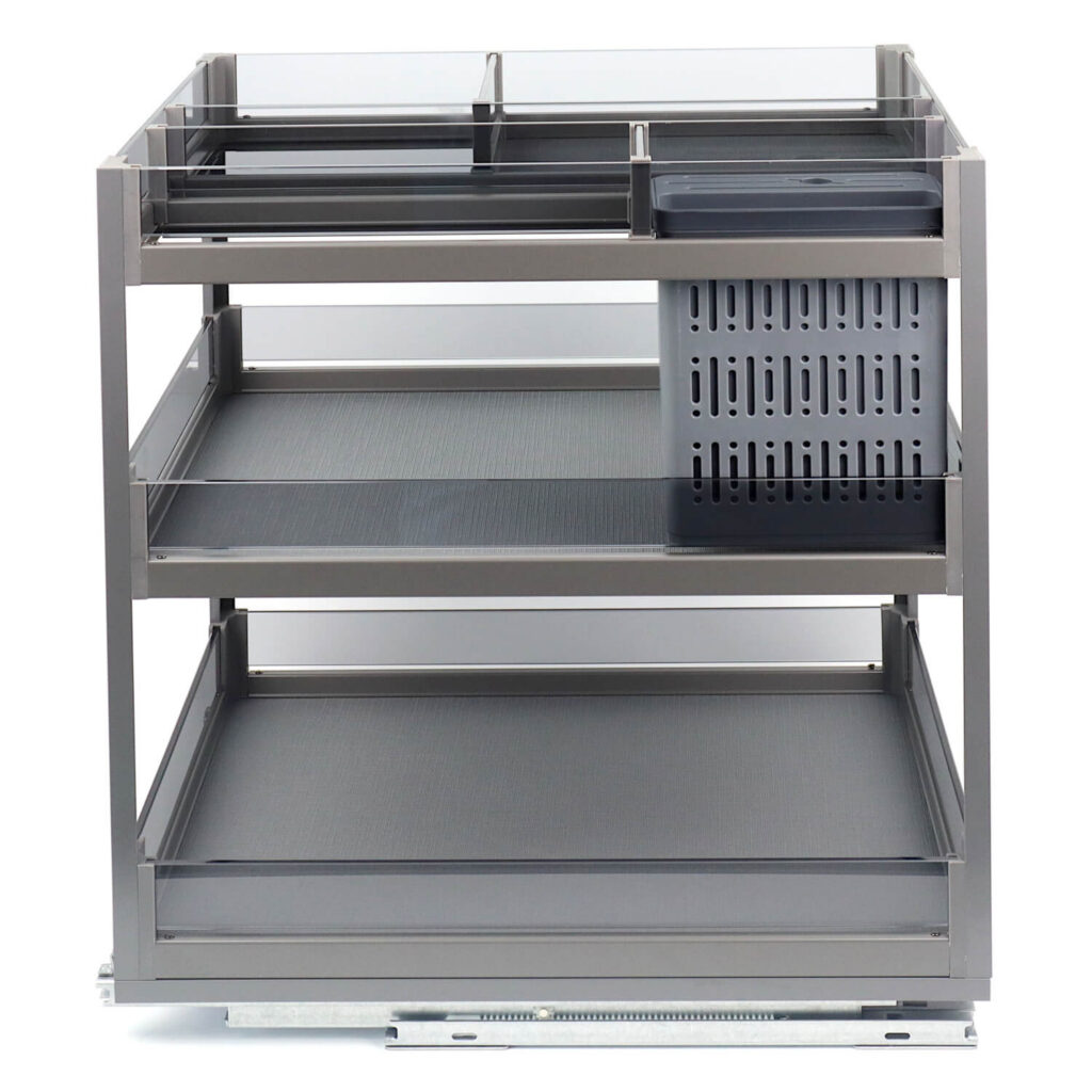 Kosz Cargo Phantom jest w kolorze antracytowym, co sprawia, że doskonale komponuje się z różnymi stylami wnętrzarskimi. Szklane boki zapewniają łatwy wgląd do zawartości kosza, co ułatwia organizowanie przestrzeni kuchennej, wykonane są z ekskluzywnie przyciemnionego szkła hartowanego, zapewnia to ich trwałość i odporność na uszkodzenia. Przegródki można łatwo wyjmować, przez co nie ma problemu z ich wyczyszczeniem. Dno półek zostało pokryte antypoślizgowym materiałem, co zapobiega przesuwaniu się przedmiotów.
