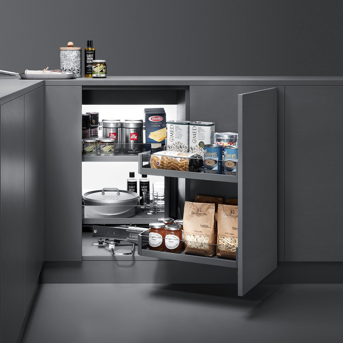 Kosz ma wymiary 860 x 968 x 500 mm (szerokość x głębokość x wysokość) i posiada 4 półki, z których każda wyłożona jest tworzywem antypoślizgowym, zapobiegając przesuwaniu się przechowywanych produktów. Jego 2 poziomy sprawiają, że organizacja zawartości staje się jeszcze bardziej uporządkowana. Kolor kosza, czyli antracyt, nadaje mu nowoczesny i elegancki wygląd, który świetnie komponuje się z różnymi wnętrzami kuchennymi. Dzięki swojej konstrukcji, Phantom Magic Corner doskonale sprawdza się do przechowywania garnków, dużych talerzy i innych kuchennych akcesoriów.