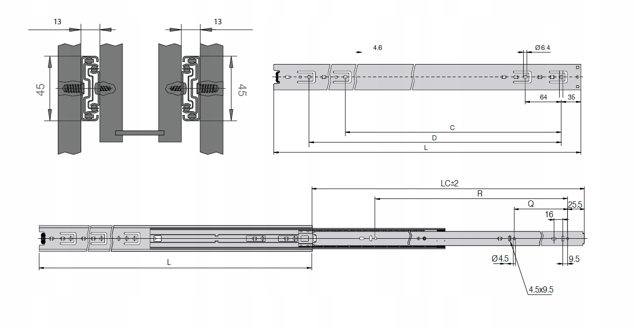 Prowadnica kulkowa GH, L-400mm, H45mm, obc. 35kg, kpl
