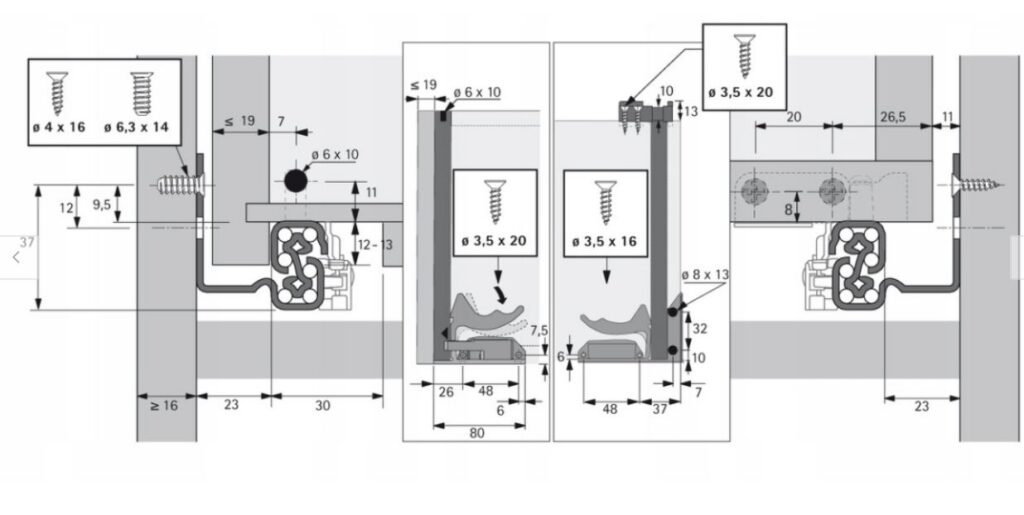 - Koncepcja jednej platformy: identyczne wymiary korpusu, szuflady i frontu przy prowadnicach Quadro z częściowym i pełnym wysuwem z montażem nasuwanym