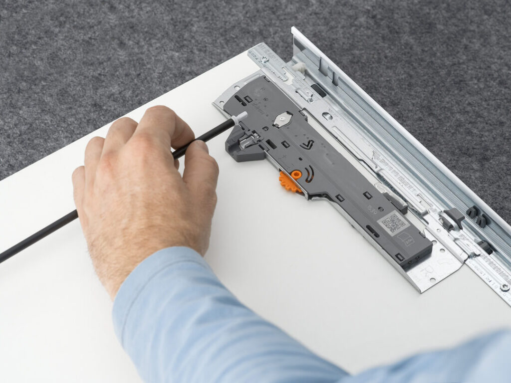 Reling T60.1125W do synchronizacji szuflad wyposażonych w systemy prowadnic Tip-On Blumotion – Tandembox i Legrabox. Służy również do synchronizacji prowadnic dolnego montażu Movento.