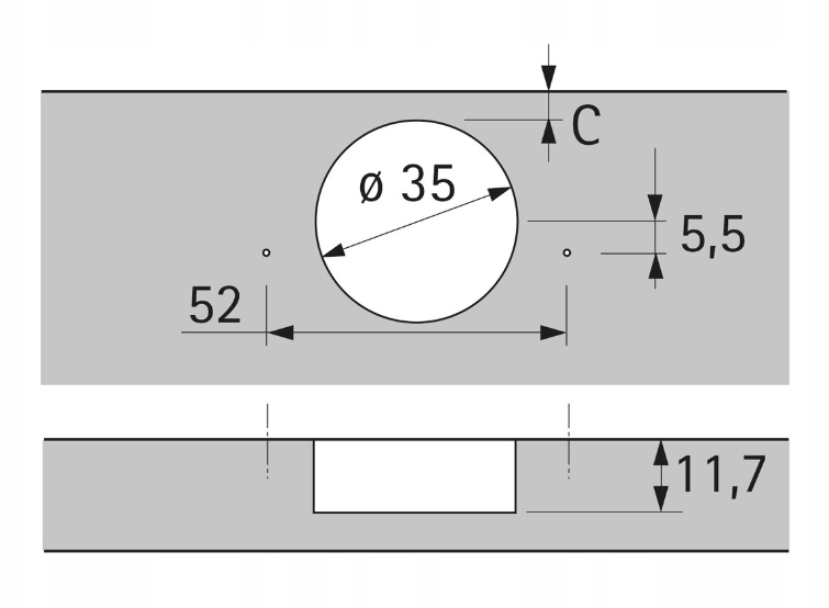 - Rozstaw nawierceń: 52 x 5,5 mm