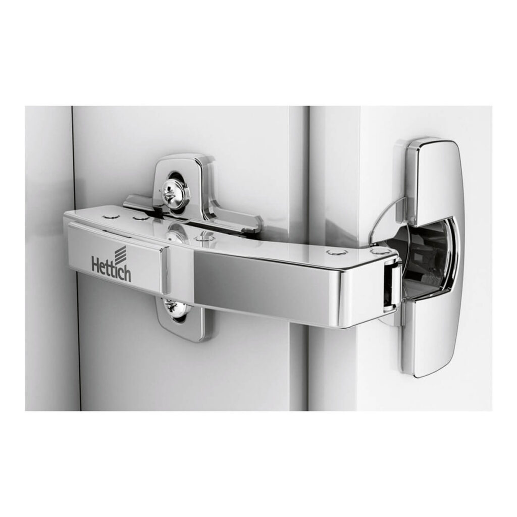 Zawias równoległy Hettich Sensys z wbudowanym cichym domykiem o kącie otwarcia 95°, montowany w szafkach narożnych 90°.