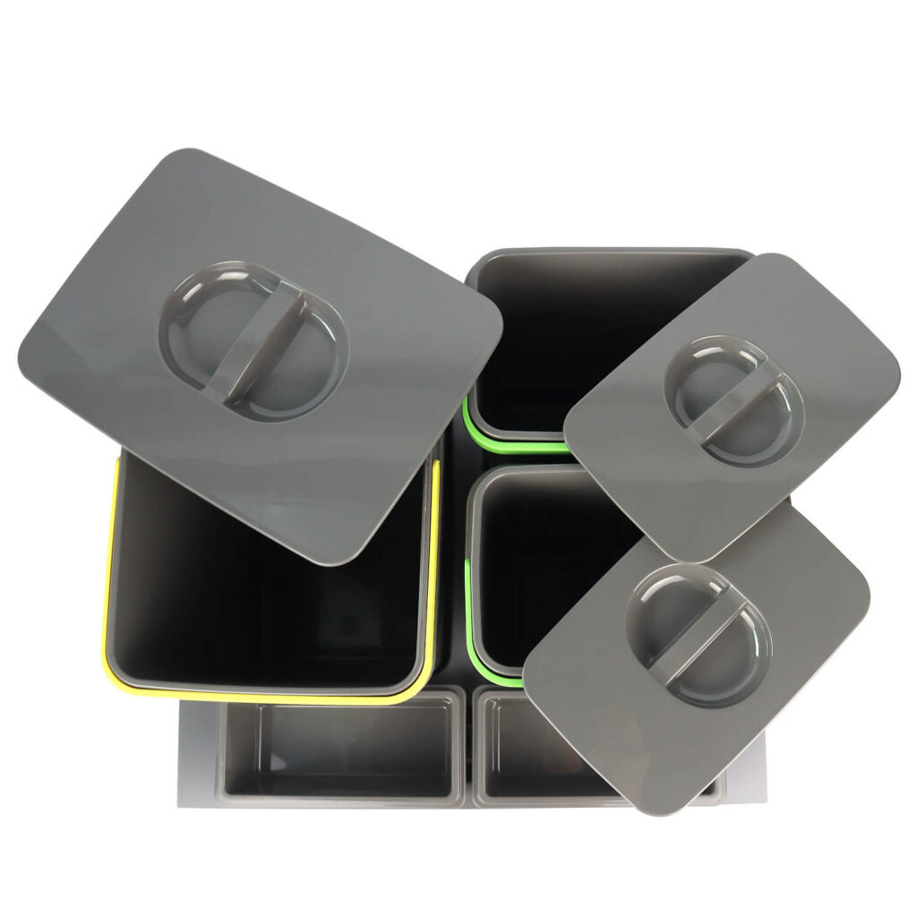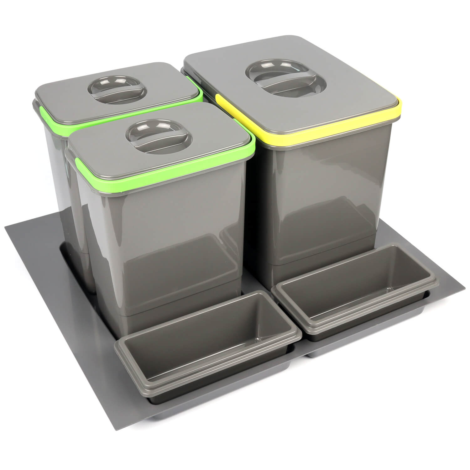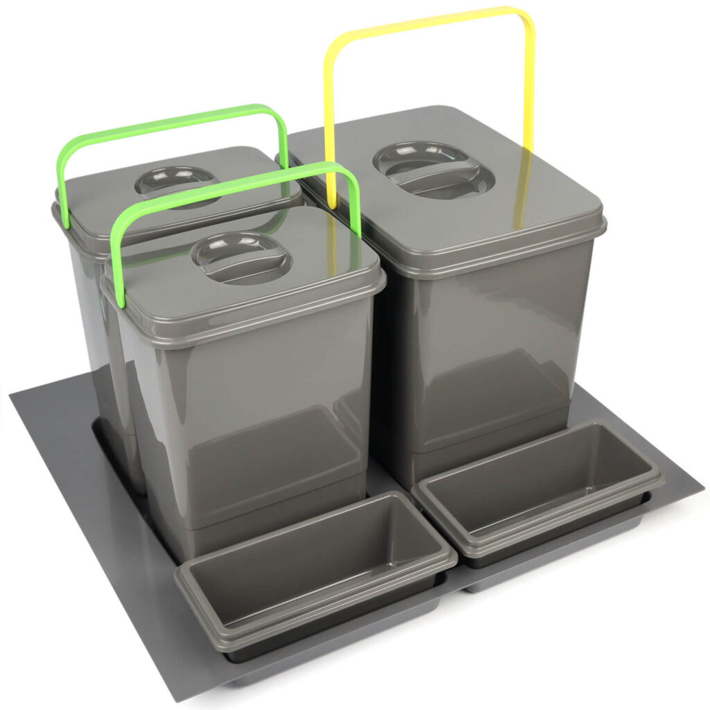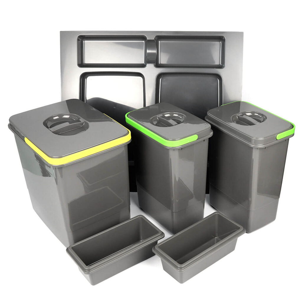 Sortownik na śmieci do szuflady lub szafki o szerokości min. 600mm to idealne rozwiązanie dla osób poszukujących praktycznych i funkcjonalnych rozwiązań do segregowania odpadów. Dzięki niemu możliwe jest efektywne wykorzystanie dostępnej przestrzeni i zminimalizowanie bałaganu w kuchni. Kosz składa się z 3 pojemników (1X15L+2X8L) , tacki do szafki o szerokości 600mm z możliwością przycięcia i 2 brytfankek na detergenty.