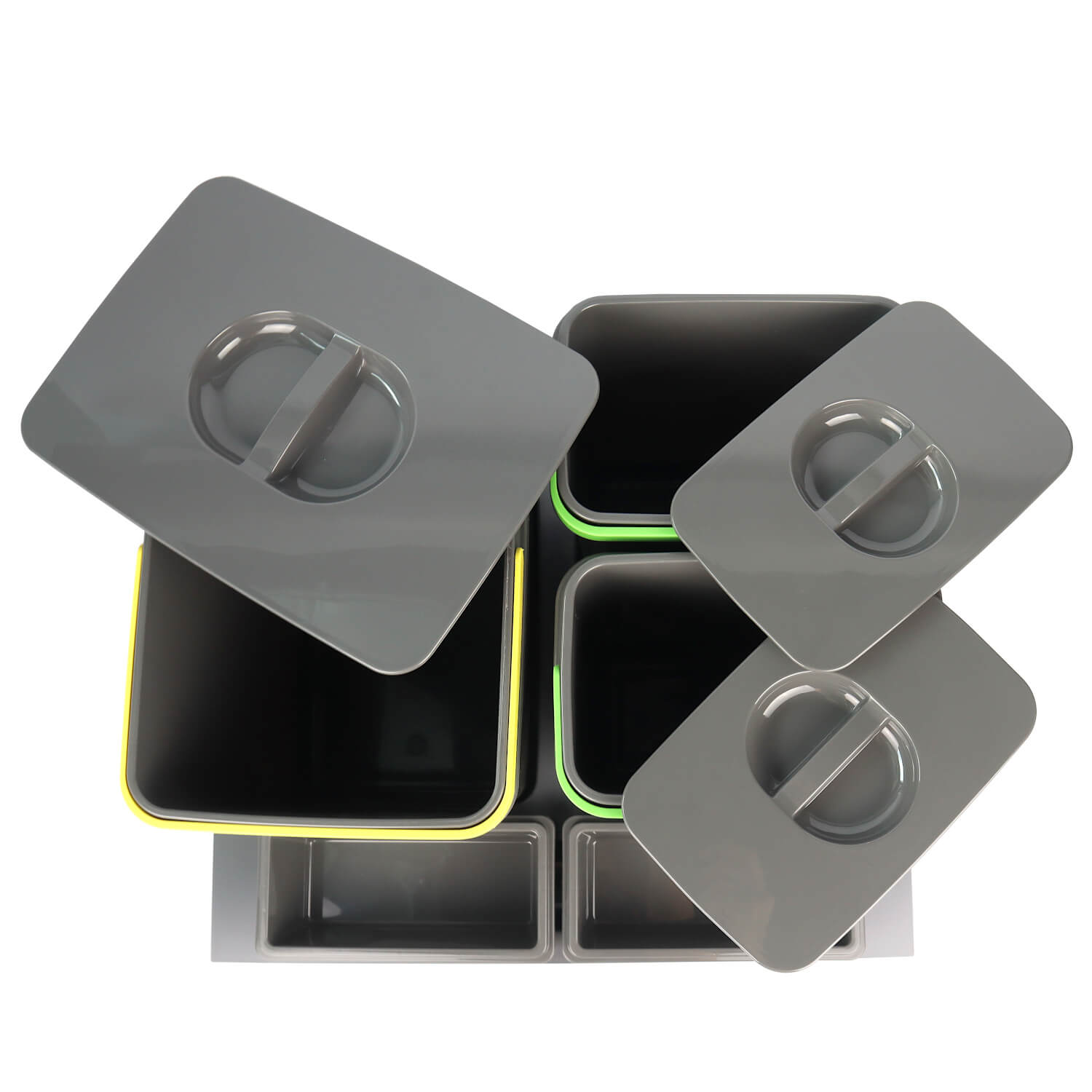 Sortownik pozwala na segregację odpadów w trzech oddzielnych pojemnikach o sumarycznej pojemności 29L. Segregator można łatwo zamontować w szufladzie lub szafce o szerokości zewnętrznej 600mm, co pozwala na oszczędność miejsca w kuchni.