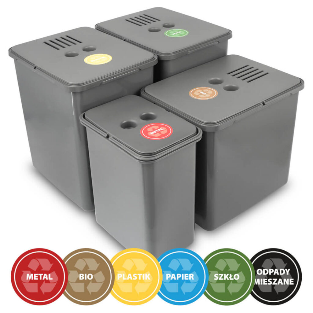 - Naklejki do segregacji na papier, plastik, metal, szkło, bio i odpady mieszane w komplecie ułatwiają właściwe rozmieszczenie różnych rodzajów odpadów.