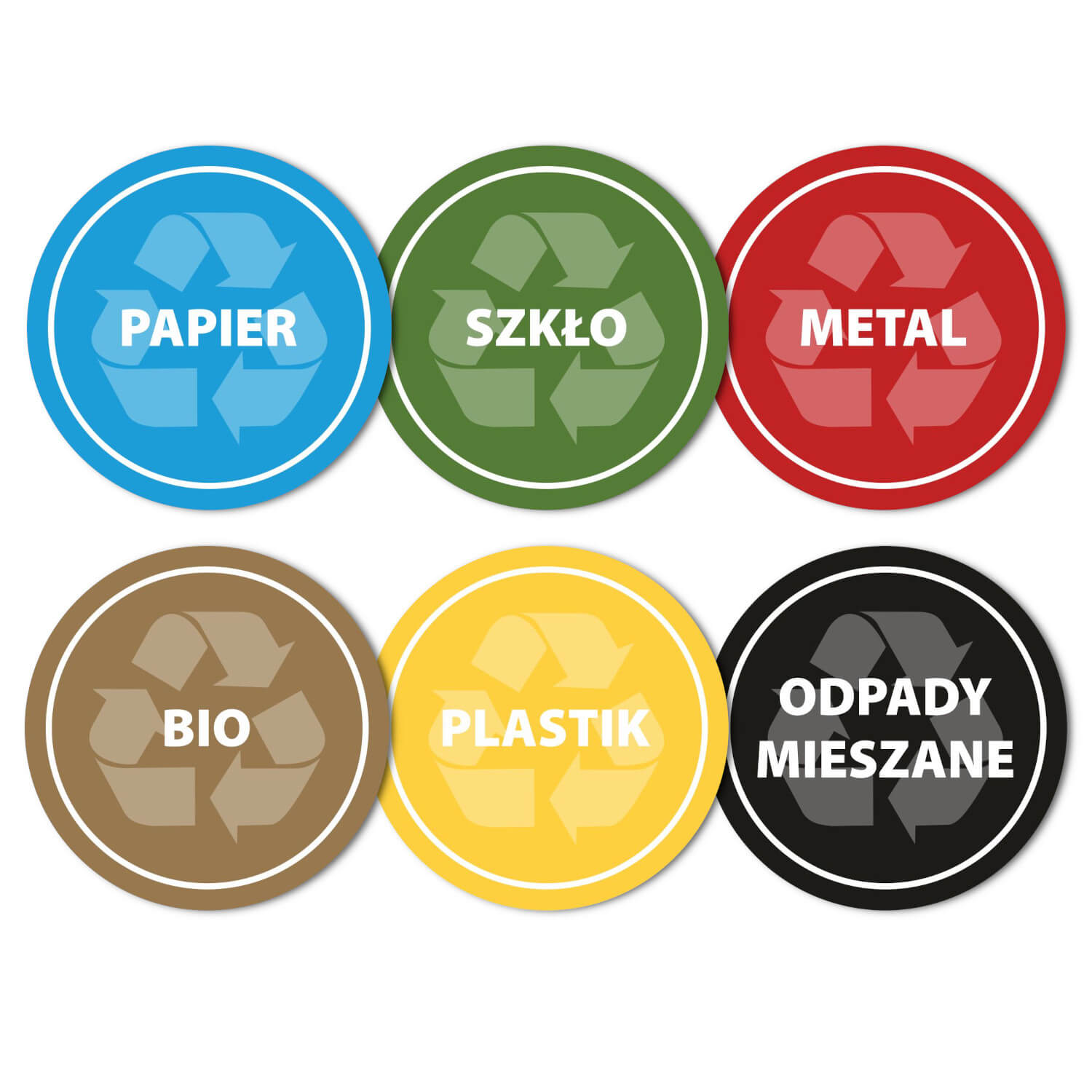 • Naklejki do segregacji na papier, plastik, metal, szkło, bio i odpady mieszane w komplecie ułatwiają właściwe rozmieszczenie różnych rodzajów odpadów.