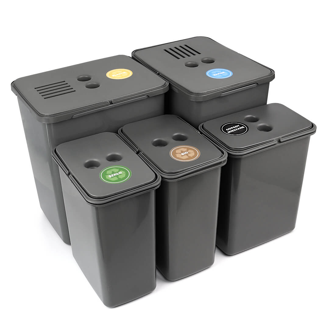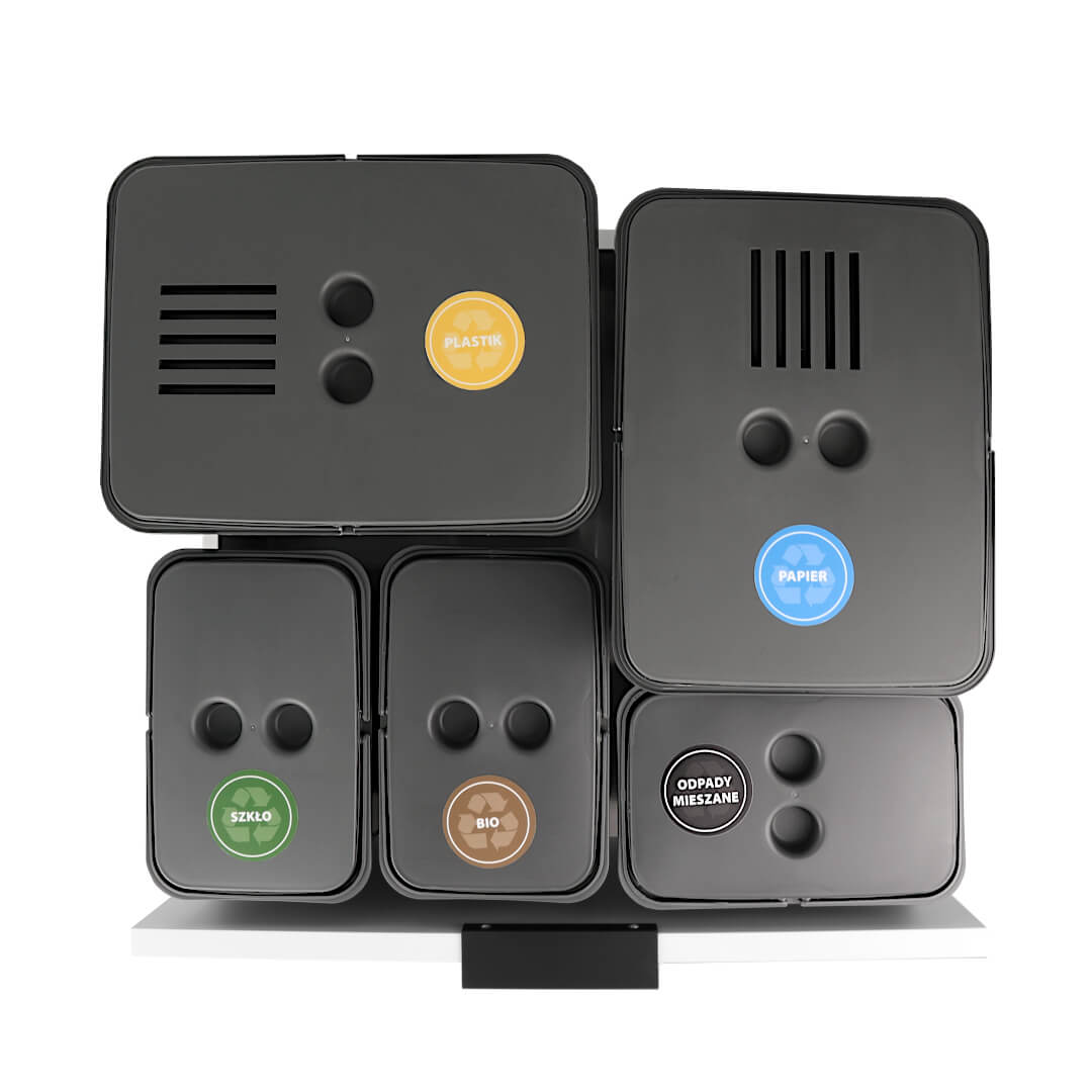 • Kolor: grafitowy – komponuje się z różnymi stylami wnętrz, zapewniając harmonijny wygląd i stwarzając atmosferę czystości. Dodatkowo, kolor grafitowy jest praktyczny, ponieważ łatwo maskuje ewentualne zabrudzenia, co niewątpliwie ułatwia utrzymanie sortownika w nienagannej czystości przez długi czas.