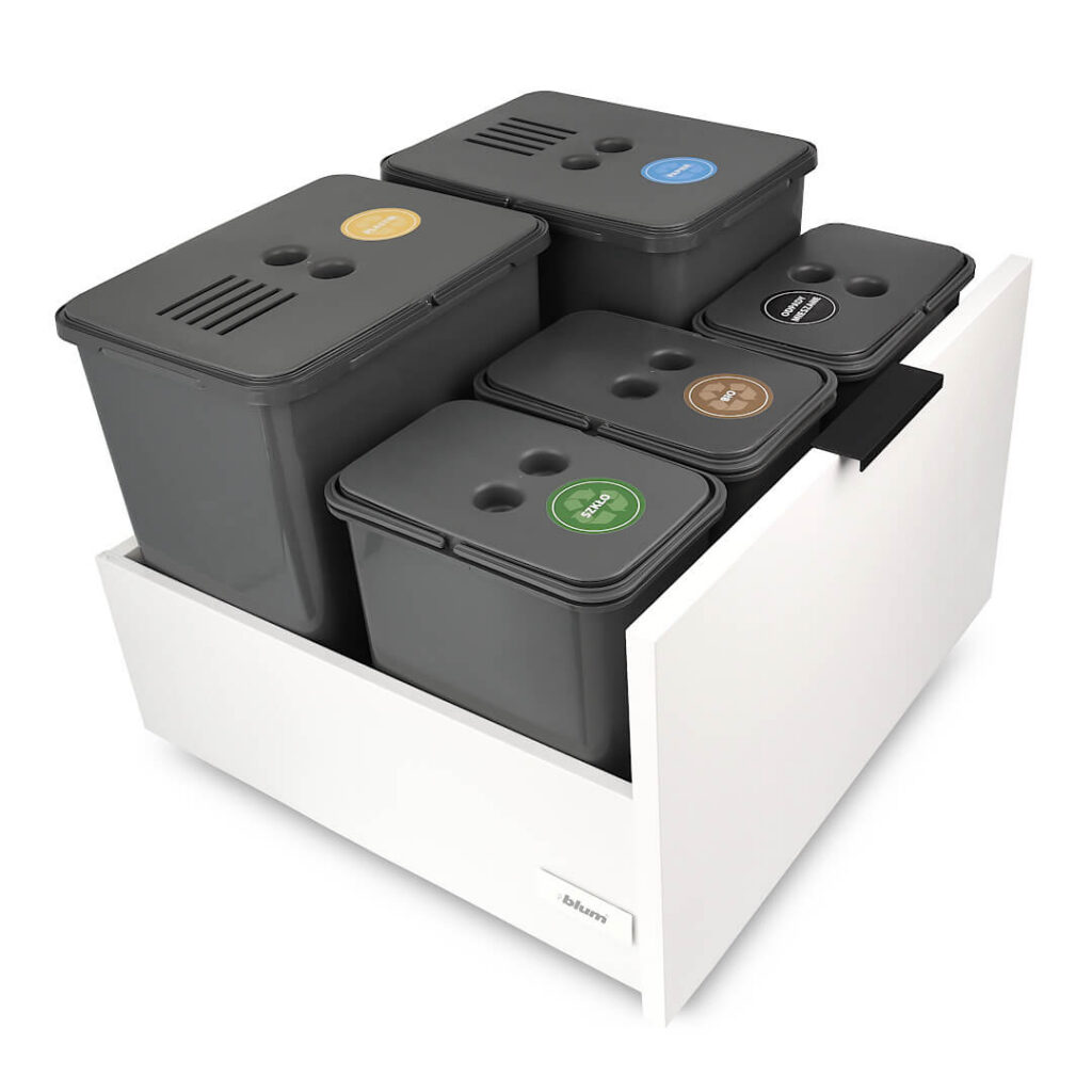 Sortownik pozwala na segregację odpadów w 5 oddzielnych pojemnikach o pojemności 2×20, i 3×8  litrów co daje nam sumaryczną pojemność aż 61L.  Segregator można łatwo zamontować w szufladzie lub szafce o szerokości zewnętrznej 600mm, co pozwala na oszczędność miejsca w kuchni.
