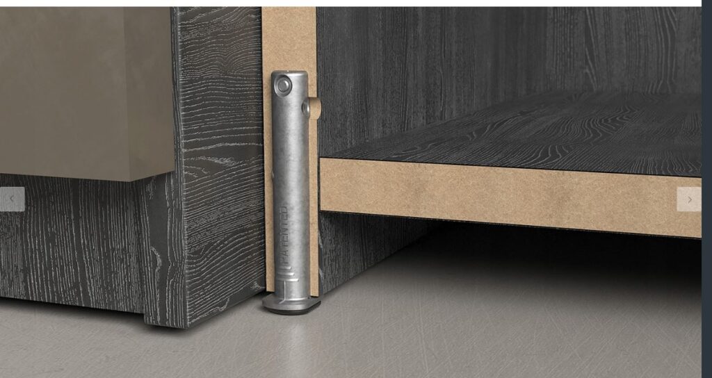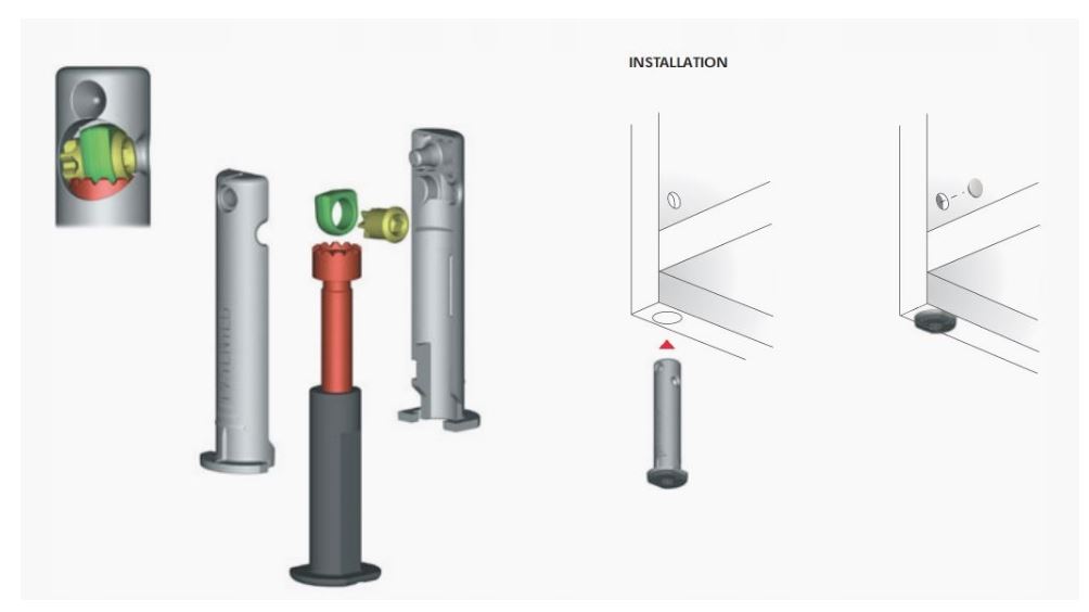 • Ukryty regulator wysokości, odpowiedni do stosowania w ciężkich szafach, regałach i meblach modułowych.
