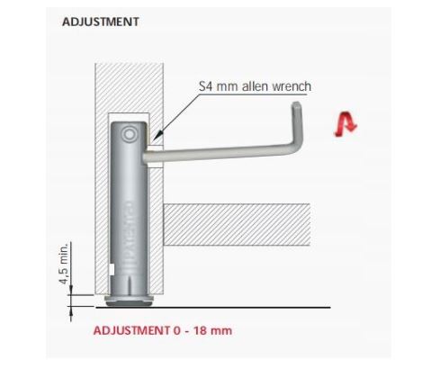 • Regulacja realizowana jest poprzez przekładnię. Może być przeprowadzona od środka mebla, przez otwór Ø 8 mm w boku korpusu, przy użyciu klucza imbusowego S4.