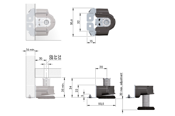 - Regulacja od góry: Możliwość regulacji przez otwór Ø6 mm lub Ø8 mm w panelu dolnym, przy użyciu klucza imbusowego S4 lub S6.