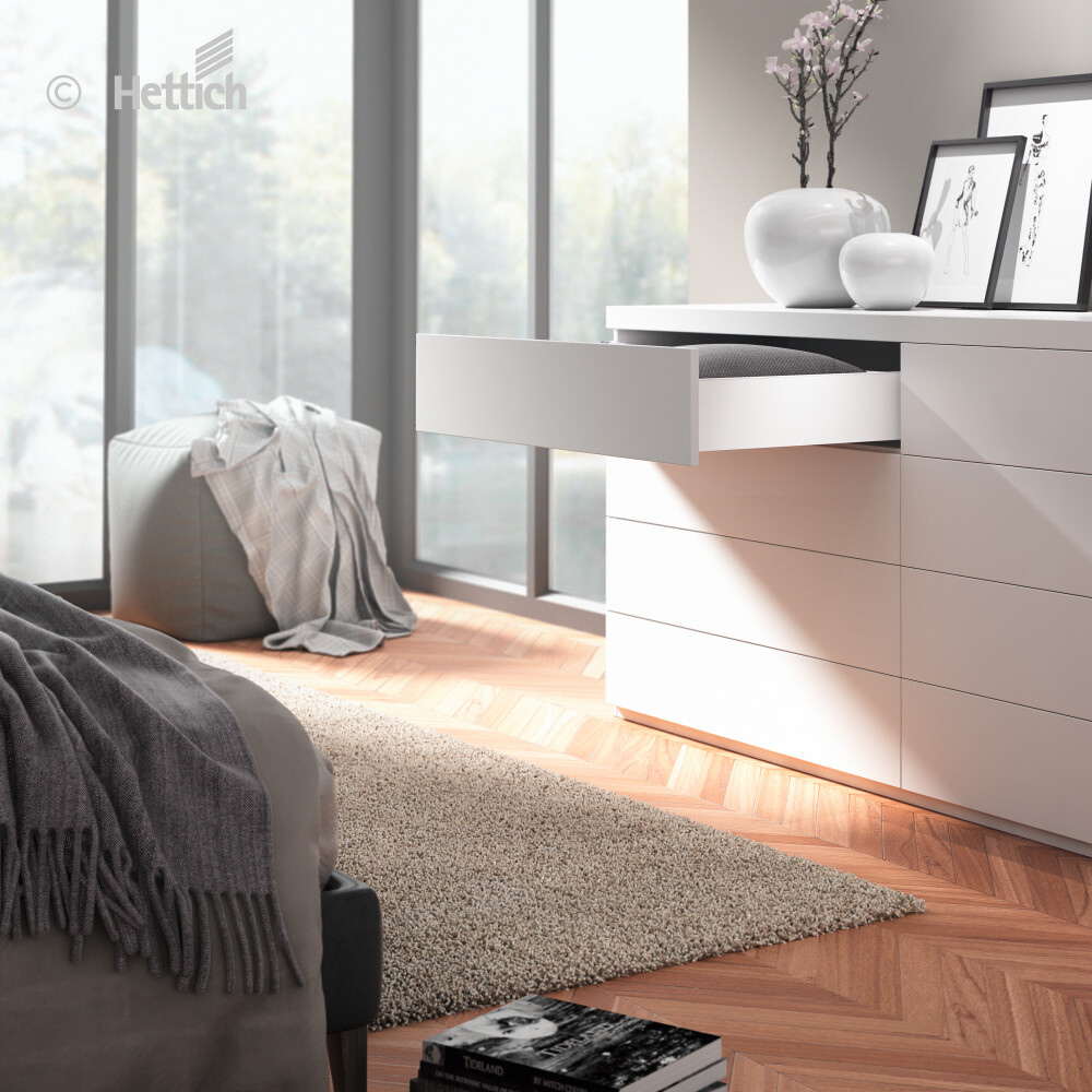 Szuflada AvanTech YOU, dzięki smukłym i prostym bokom, zachwyca nieskazitelnym pięknem. Jest także kluczem do urzeczywistnienia własnych pomysłów: dzięki bogactwie opcji w zakresie personalizacji oraz dużej swobodzie pod względem doboru kolorów, kształtów i materiałów. Atrakcyjne akcenty wizualne zapewniają profile dekoracyjne, DesignCapes oraz ozdobne wypełnienia. Jeden system szuflad, dwa rodzaje prowadnic oraz wiele funkcji zapewniających komfort użytkowania. Dzięki jednemu schematowi nawierceń, można je łączyć ze sobą w dowolny sposób. To efektywne rozwiązanie dla różnych segmentów rynku, zastosowań i potrzeb klientów.