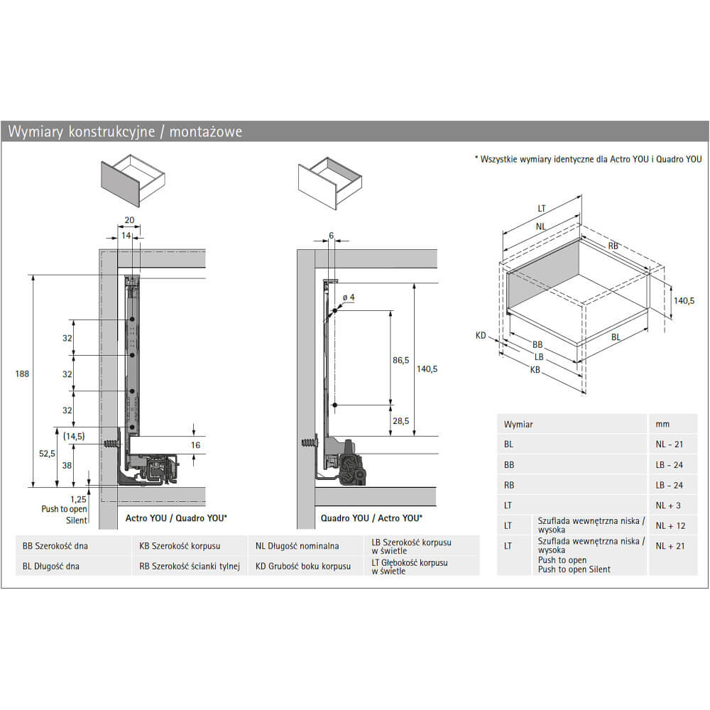 - Szuflada w zestawie z prowadnicami Quadro YOU (obciążenie 30kg)