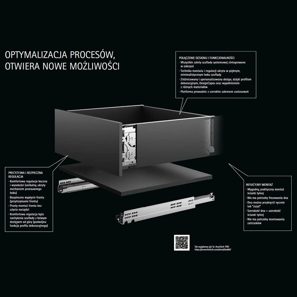 Szuflada AvanTech YOU, dzięki smukłym i prostym bokom, zachwyca nieskazitelnym pięknem. Jest także kluczem do urzeczywistnienia własnych pomysłów: dzięki bogactwie opcji w zakresie personalizacji oraz dużej swobodzie pod względem doboru kolorów, kształtów i materiałów. Atrakcyjne akcenty wizualne zapewniają profile dekoracyjne, DesignCapes oraz ozdobne wypełnienia. Jeden system szuflad, dwa rodzaje prowadnic oraz wiele funkcji zapewniających komfort użytkowania. Dzięki jednemu schematowi nawierceń, można je łączyć ze sobą w dowolny sposób. To efektywne rozwiązanie dla różnych segmentów rynku, zastosowań i potrzeb klientów.