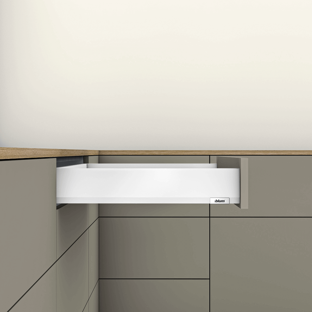 Szuflada Blum Merivobox w kolorze białym o długości prowadnicy 500mm i wysokości M (108mm). Obciążenie prowadnicy max: 40kg. MERIVOBOX można wyposażyć w technologie ruchu TIP-ON BLUMOTION lub SERVO DRIVE i stabilizację boczną