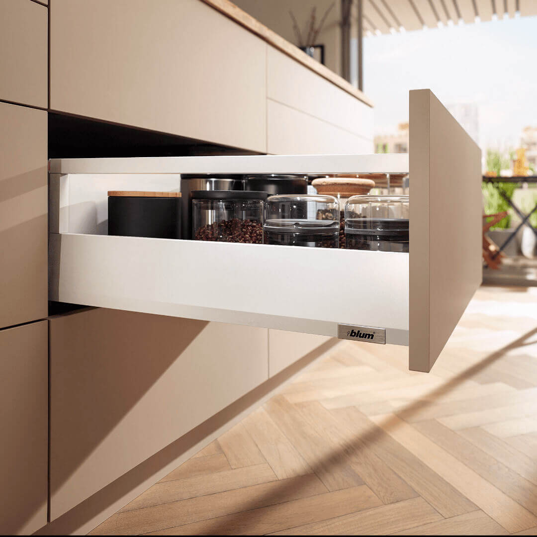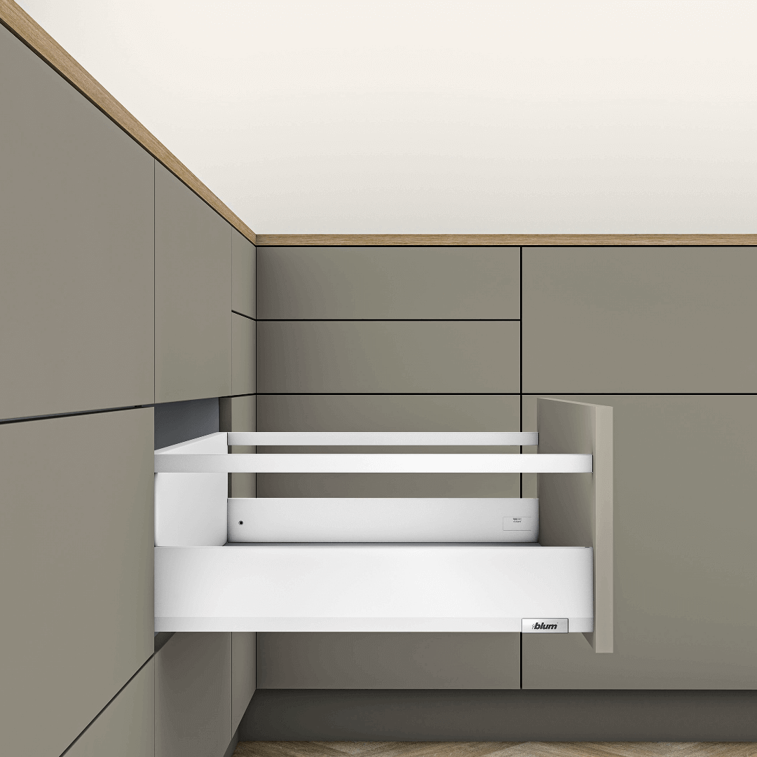 Szuflada Blum Merivobox w kolorze białym o długości prowadnicy 500mm i wysokości E (209mm). Obciążenie prowadnicy max: 40kg. MERIVOBOX można wyposażyć w technologie ruchu TIP-ON BLUMOTION lub SERVO DRIVE i stabilizację boczną