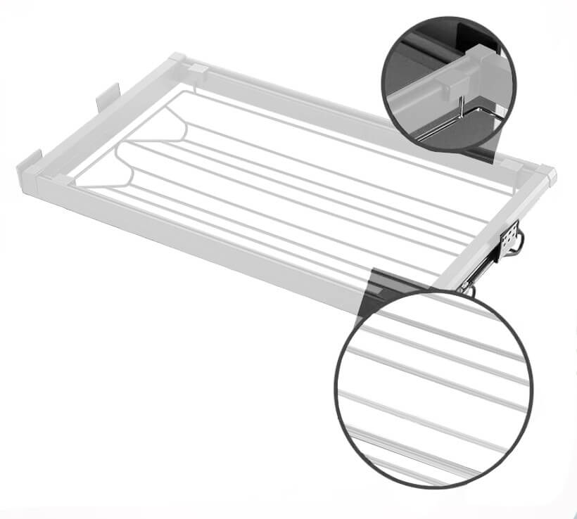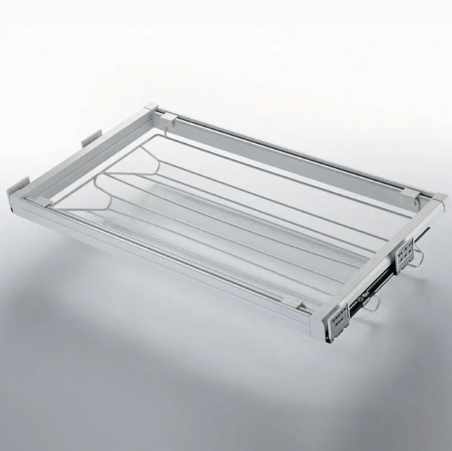 Wysokiej jakości szuflada wysuwana na buty do szafy i garderoby, przeznaczona do organizacji obuwia. Szuflada jest zamontowana na prowadnicach, co umożliwia jej wysuwanie i schowanie w szafie, dzięki temu zyskujemy dodatkową przestrzeń i jednocześnie utrzymujemy porządek w garderobie.