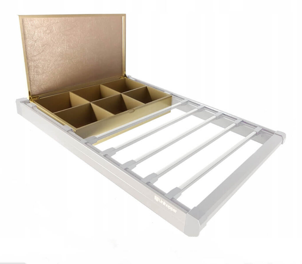 - pojemna skrzynka – dodatkowa skrzynka do półki zawierająca 6 pojemnych przegródek, które są odpowiednie do przechowywania pasków, zegarków, a nawet biżuterii.