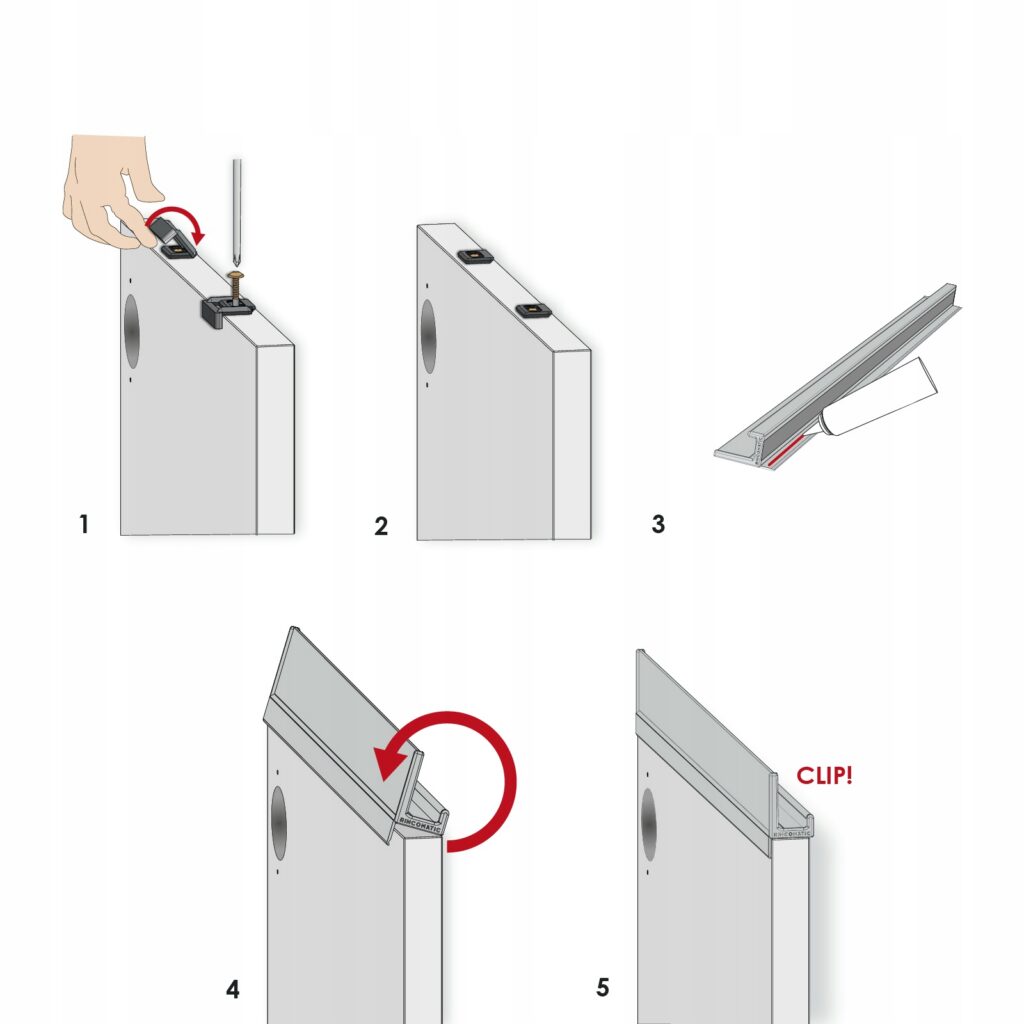 - Uchwyt nie wymaga frezowania w płycie wystarczy przykręcić elementy montażowe i wcisnąć uchwyt.