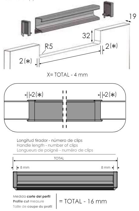 - Uchwyt nie wymaga frezowania w płycie (z wyjątkiem wersji Total oraz Partial gdzie należy wykonać „wcięcie” we froncie) wystarczy przykręcić elementy montażowe i wcisnąć uchwyt.