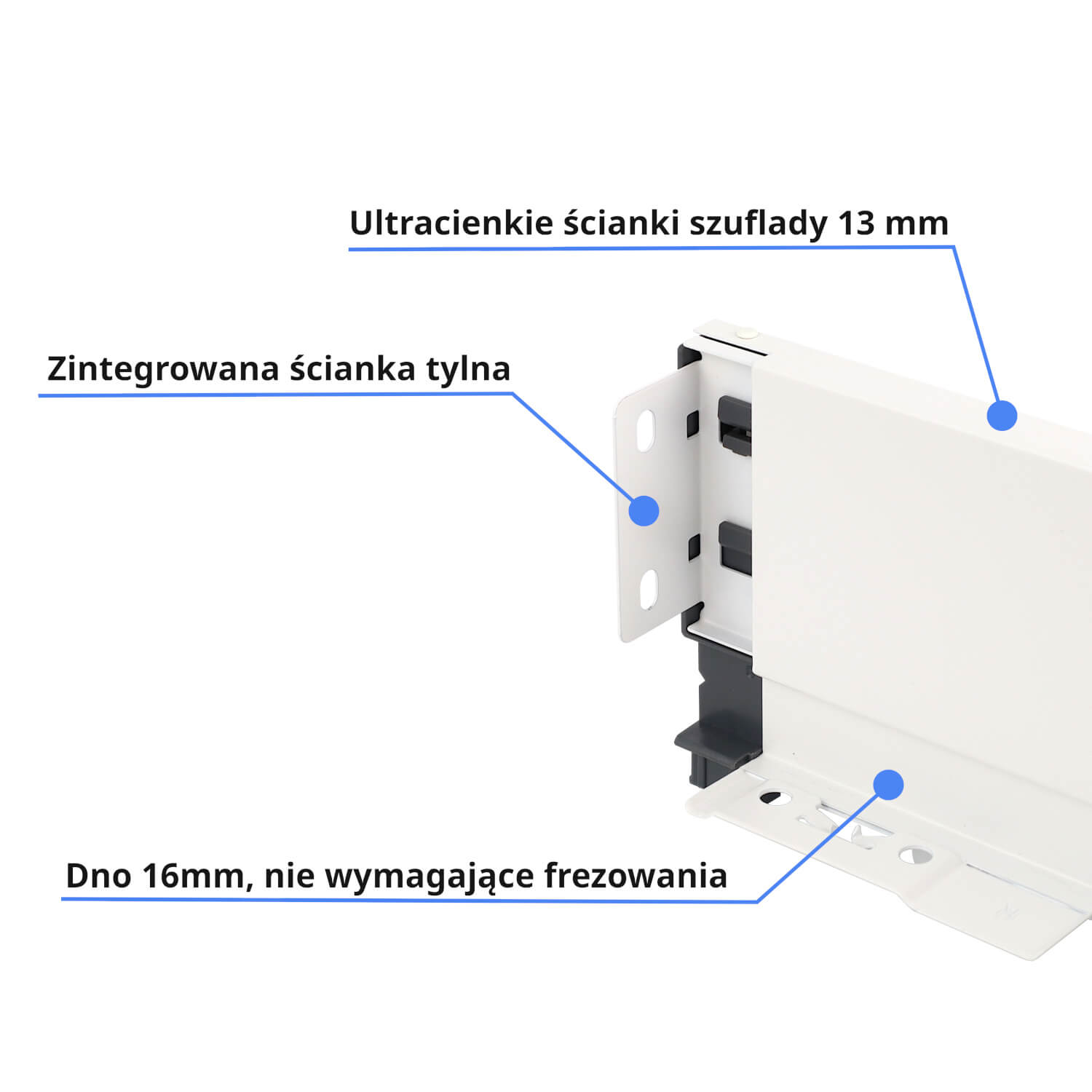 - Grubość ścianek: szuflada charakteryzuje się ultra cienkimi ściankami o grubości 13 mm, co nadaje jej nowoczesny wygląd i lekkość.