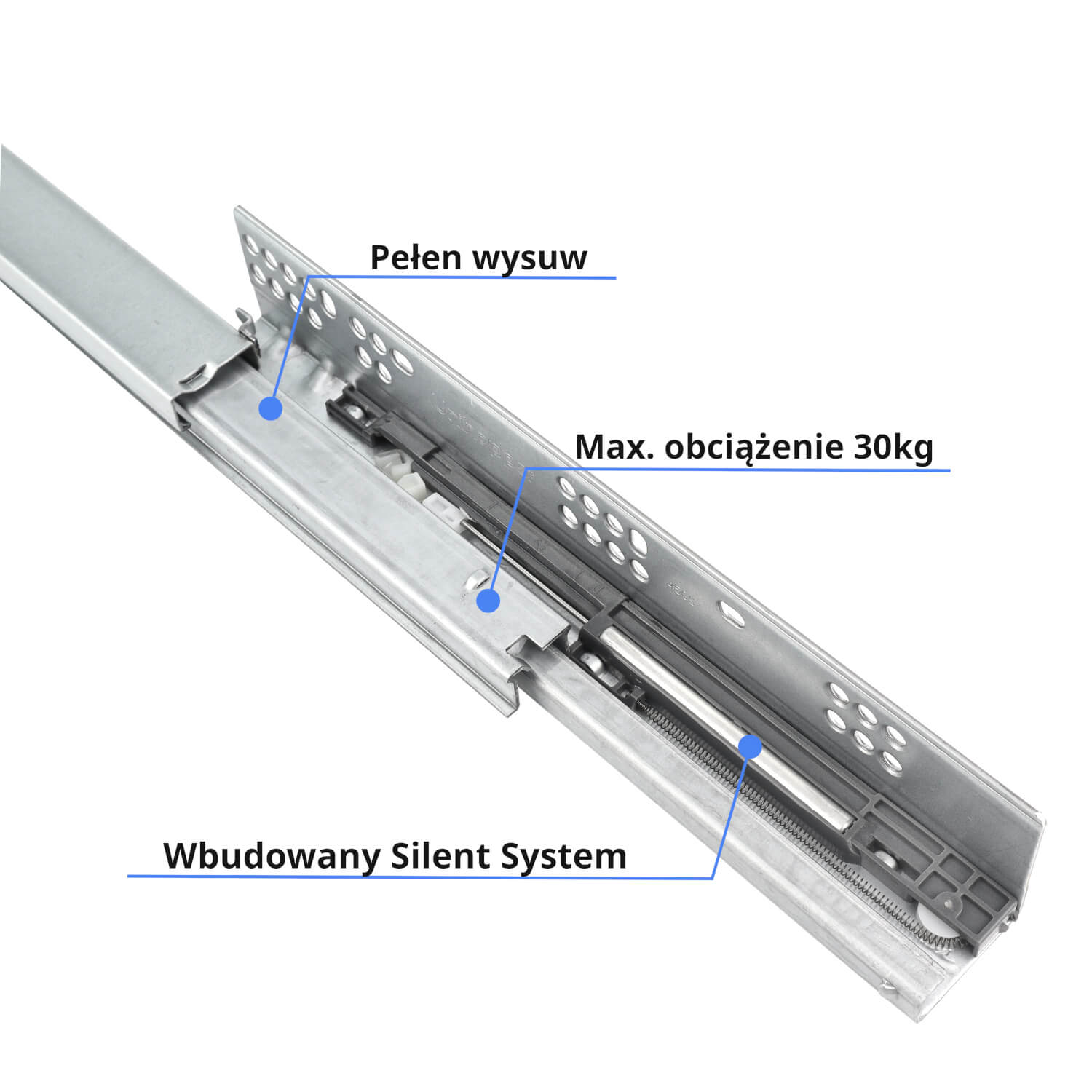 - System Soft Close: szuflada jest wyposażona w innowacyjny system miękkiego domyku nowej generacji, który zapewnia ciche, płynne i bezproblemowe zamykanie szuflady.