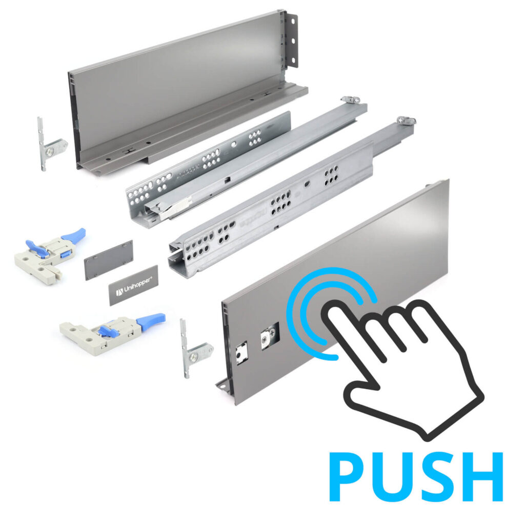 Konstrukcja Unihopper została starannie zaprojektowana, aby zapewnić płynną pracę i długotrwałą wytrzymałość. Szuflada może pomieścić obciążenie do 30 kg, co czyni ją praktycznym rozwiązaniem do przechowywania różnych przedmiotów. Dzięki zastosowaniu mechanizmu Push to Open, wystarczy dotknąć frontu szuflady aby się otworzyła. Cały system schowany jest wewnątrz prowadnicy. Na froncie szuflady nie potrzebne są żadne dodatkowe uchwyty. Daje to minimalistyczny wygląd całej aranżacji.