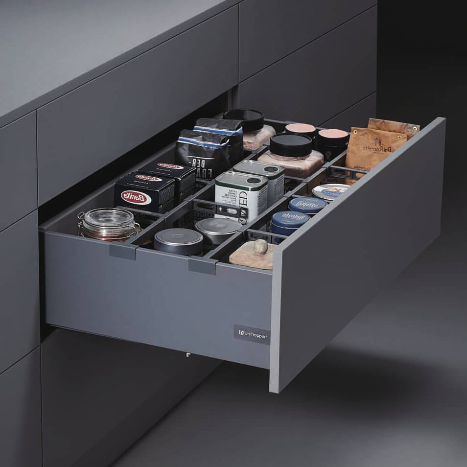 Unihopper to nie tylko estetyczne rozwiązanie, ale przede wszystkim praktyczne i wygodne. Pełny wysuw szuflady pozwala na łatwy dostęp do jej zawartości, a Push to Open system schowany jest wewnątrz prowadnicy pozwala na bezuchwytowe jej otwarcie.