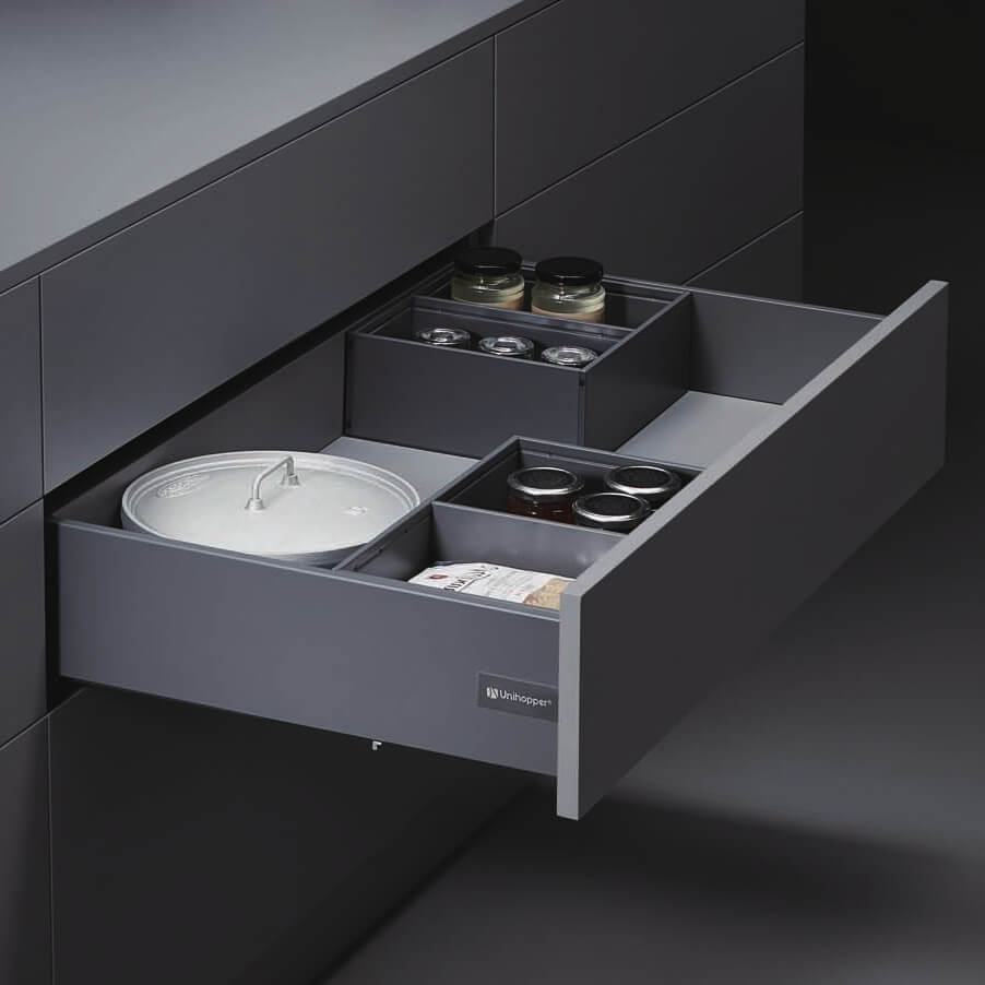 9. Wielofunkcyjność: Szuflady Unihopper znajdują zastosowanie we wszystkich rodzajach mebli, takich jak kuchenne, pokojowe czy łazienkowe, co sprawia, że są wszechstronnym rozwiązaniem do przechowywania.