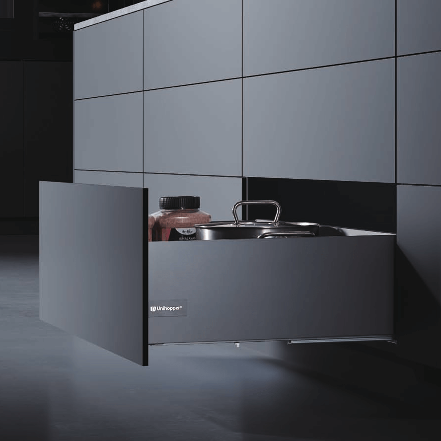 Konstrukcja Unihopper została starannie zaprojektowana, aby zapewnić płynną pracę i długotrwałą wytrzymałość. Szuflada może pomieścić obciążenie do 30 kg, co czyni ją praktycznym rozwiązaniem do przechowywania różnych przedmiotów. Dzięki zastosowaniu mechanizmu Push to Open, wystarczy dotknąć frontu szuflady aby się otworzyła. Cały system schowany jest wewnątrz prowadnicy. Na froncie szuflady nie potrzebne są żadne dodatkowe uchwyty. Daje to minimalistyczny wygląd całej aranżacji.