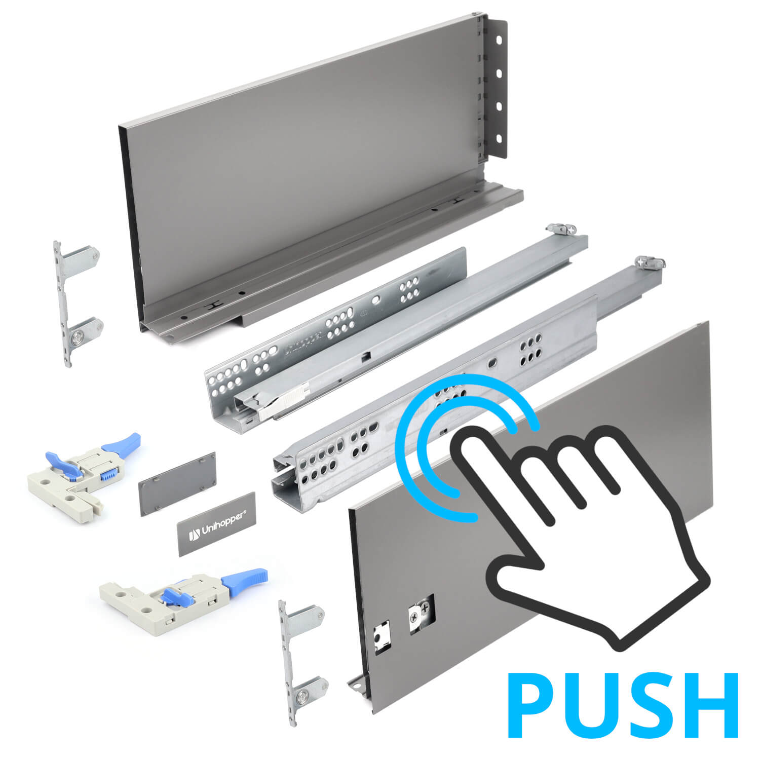 Unihopper to nie tylko estetyczne rozwiązanie, ale przede wszystkim praktyczne i wygodne. Pełny wysuw szuflady pozwala na łatwy dostęp do jej zawartości, a Push to Open system schowany jest wewnątrz prowadnicy pozwala na bezuchwytowe jej otwarcie.