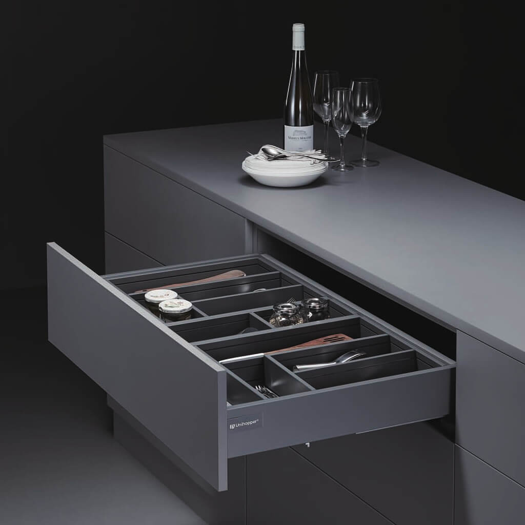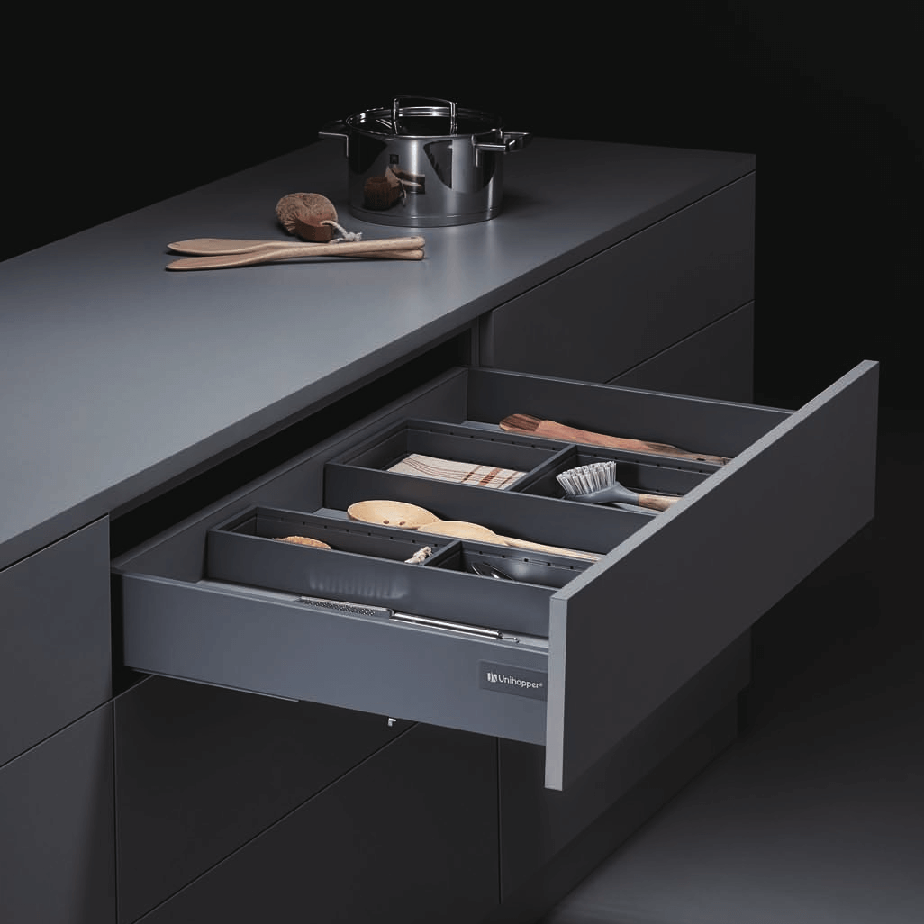 Konstrukcja Unihopper została starannie zaprojektowana, aby zapewnić płynną pracę i długotrwałą wytrzymałość. Szuflada może pomieścić obciążenie do 30 kg, co czyni ją praktycznym rozwiązaniem do przechowywania różnych przedmiotów. Dzięki zastosowaniu mechanizmu Push to Open, wystarczy dotknąć frontu szuflady aby się otworzyła. Cały system schowany jest wewnątrz prowadnicy. Na froncie szuflady nie potrzebne są żadne dodatkowe uchwyty. Daje to minimalistyczny wygląd całej aranżacji.