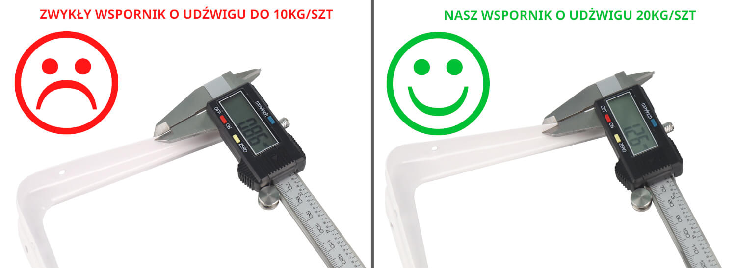 *Podana wytrzymałość wsporników została sprawdzona przez równomierne obciążenie na całej długości ramienia wspornika. W celu zapewnienia bezpiecznego użytkowania, należy równomiernie rozłożyć ciężar na wspornikach oraz solidnie i pewnie zamocować je do ściany.