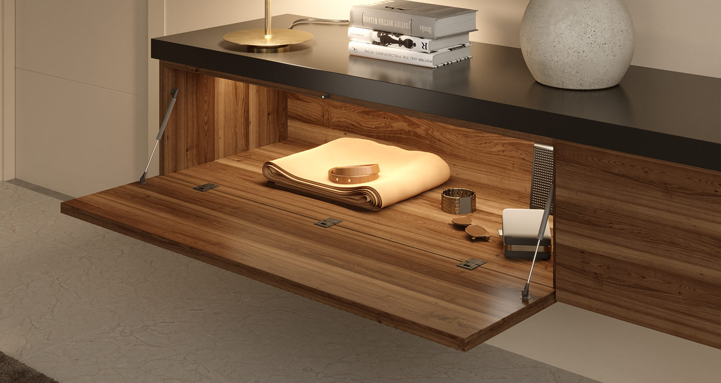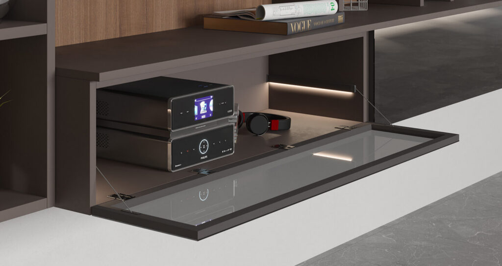 Zawias do frontów barkowych/ uchylnych otwieranych w dół. Dzięki swojemu unikalnemu projektowi doda szafkom nutkę elegancji. Zawias jest łatwy w montażu oraz posiada regulację, dzięki której szafka może otwierać się nawet do poziomu blatu.