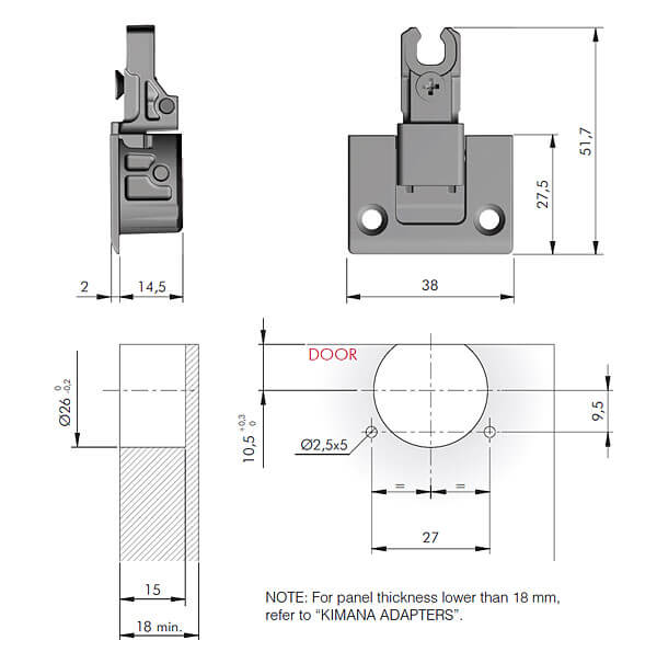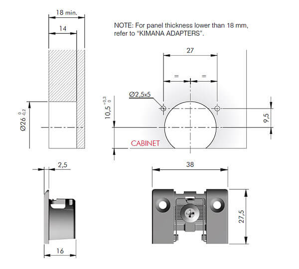 Kimana – nowy zawias zaprojektowany przez Italiana Ferramenta do frontów barkowych. Unikalny sposób pracy zawiasu umożliwia otwarcie drzwi nawet, gdy dno szafki znajduje się na tym samym poziomie co blat. Niewielkie wymiary (otwór fi 26 mm w dnie szafki i froncie) oraz minimalistyczny i elegancki wygląd tworzą funkcjonalny, jedyny w swoim rodzaju zawias. Regulacja przy pomocy wkrętaka PZ2, (pod zaślepką). Wkręty montowane są pod kątem prostym, dzięki czemu możliwy jest montaż do ram aluminiowych.