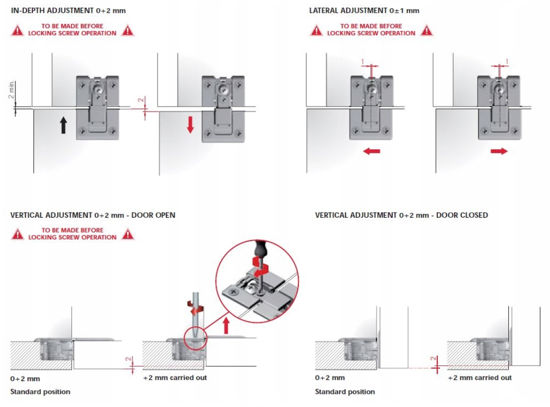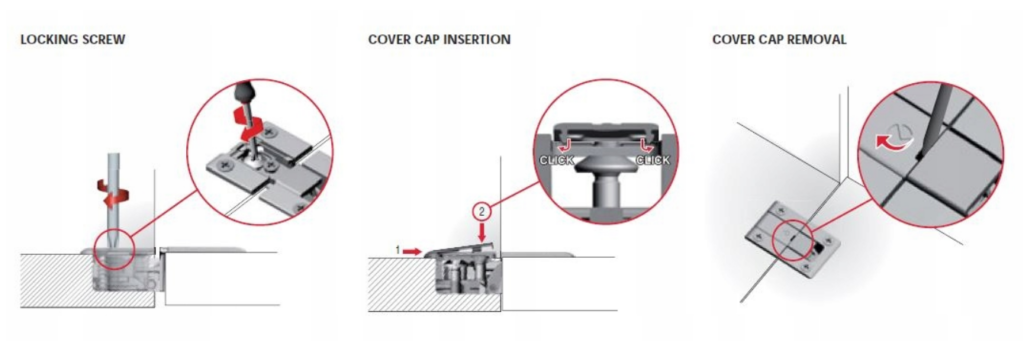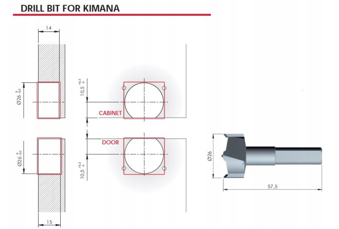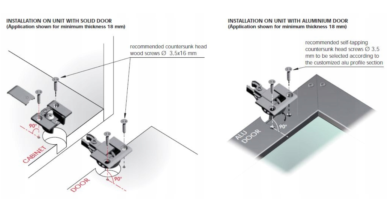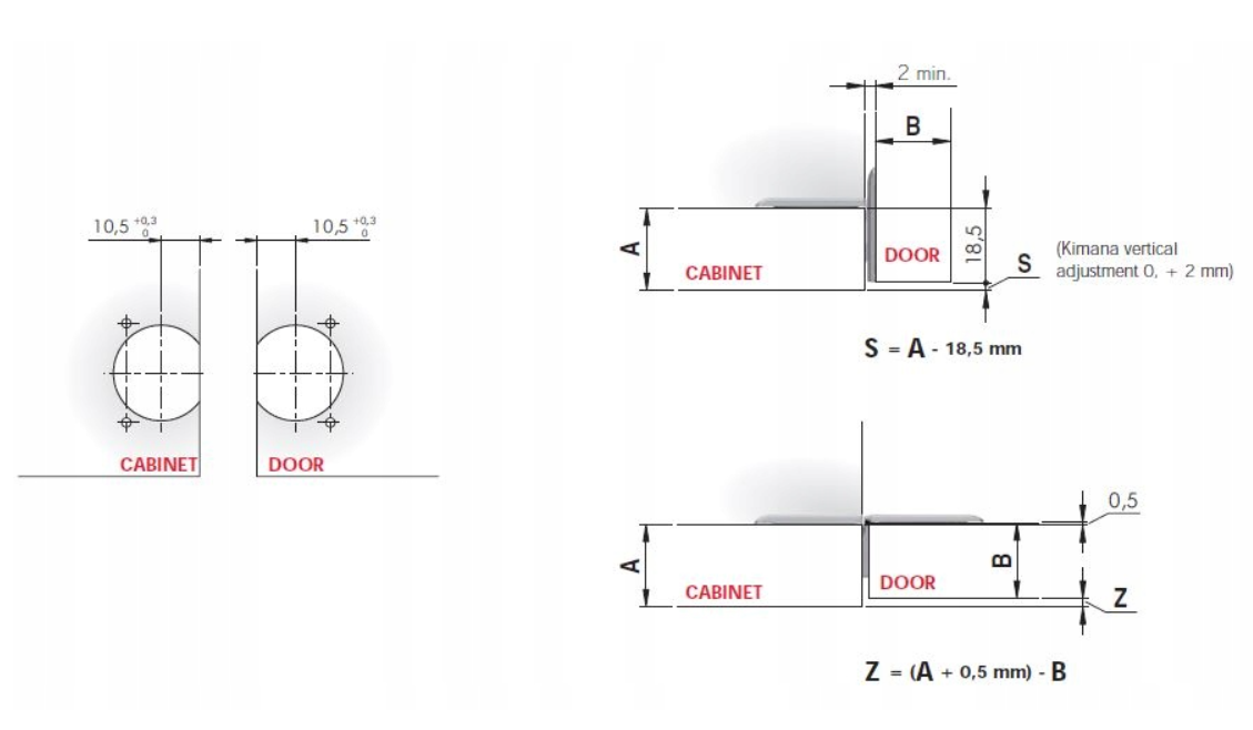 Kimana – nowy zawias zaprojektowany przez Italiana Ferramenta do frontów barkowych. Unikalny sposób pracy zawiasu umożliwia otwarcie drzwi nawet, gdy dno szafki znajduje się na tym samym poziomie co blat. Niewielkie wymiary (otwór fi 26 mm w dnie szafki i froncie) oraz minimalistyczny i elegancki wygląd tworzą funkcjonalny, jedyny w swoim rodzaju zawias. Regulacja przy pomocy wkrętaka PZ2, (pod zaślepką). Wkręty montowane są pod kątem prostym, dzięki czemu możliwy jest montaż do ram aluminiowych.