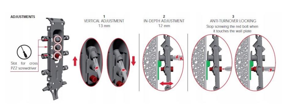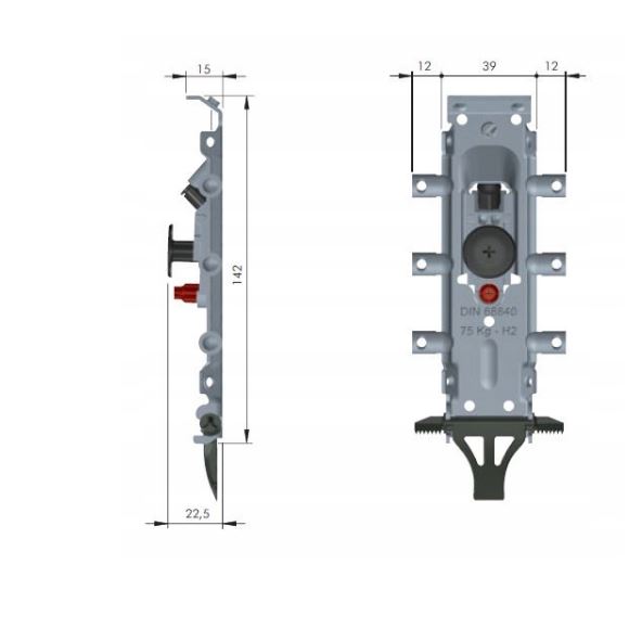 Typ: H2 Strona: lewa + prawa 3 otwory mocujące posiada regulacje możliwość montażu do ściany (za pomocą płytki) 75kg na jedną, czyli 150kg na zestaw. Zestaw zawiera: