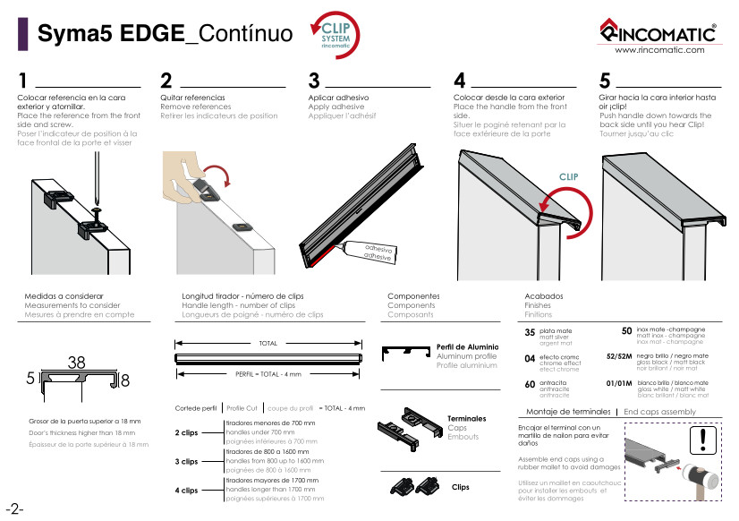 Wykorzystując zaślepki w wersji Continuo  i profil SYMA5 stworzymy uchwyt montowany na całą długość frontu. Ta wersja uchwytu świetnie nadaje się do mebli z szufladami jak również w przypadku wysokich frontów np. w szafach gdzie profil montowany jest pionowo. Ze względu na swoją szerokość profil nie nadaje się natomiast w przypadku standardowych szafek na zawiasach. Przy obliczaniu wysokości frontu należy pamiętach o odjęciu wysokości uchwytu która wynosi 5mm. W przypadku szerokości frontu, profil należy przyciąć o 4mm od całkowitego wymiaru frontu, różnica ta zostanie zniwelowana przez zaślepki.