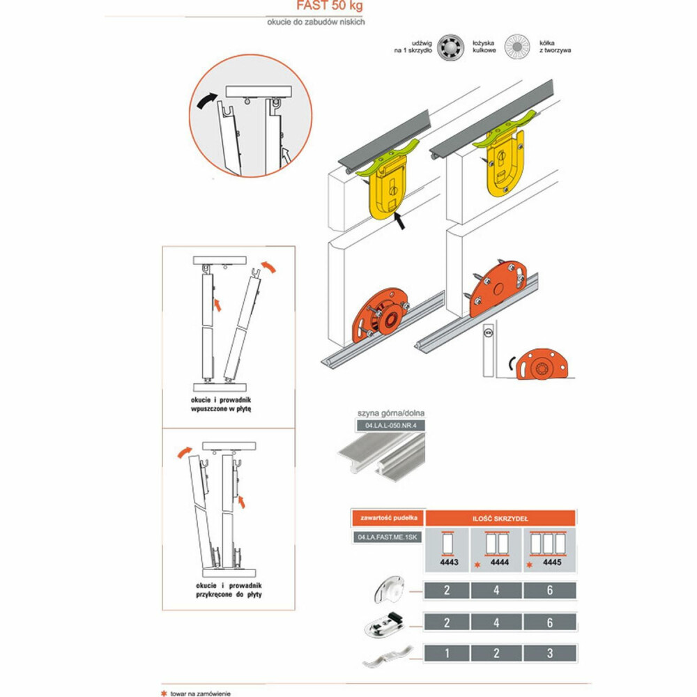 Komplet FAST 50 KG to zestaw okuć do wysokich i niskich zabudów, z jednymi skrzydłami drzwi, 1,5m