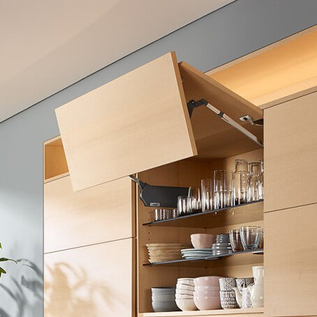Podnośnik AVENTOS HF przeznaczony jest do wysokich, dużych, dwuczęściowych frontów. Rozwiązanie oferuje dużą różnorodność planowania i projektowania, zapewniając jednocześnie użytkownikowi kuchni bezpośredni dostęp, komfort i swobodę ruchu do wnętrza szafek.