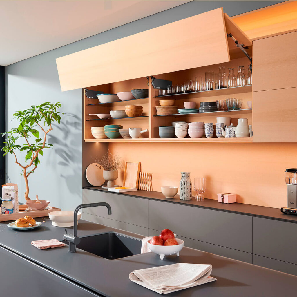 Podnośnik AVENTOS HF przeznaczony jest do wysokich, dużych, dwuczęściowych frontów. Rozwiązanie oferuje dużą różnorodność planowania i projektowania, zapewniając jednocześnie użytkownikowi kuchni bezpośredni dostęp, komfort i swobodę ruchu do wnętrza szafek.