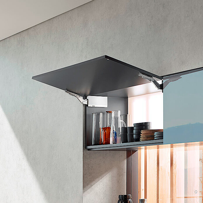 Profesjonaliści postrzegają AVENTOS HK TOP jako łatwe w montażu i obsłudze rozwiązanie do szafek górnych średniej wielkości. Nie wymaga dużo miejsca – to samo dotyczy rozwiązań do zabudowy, np. nad lodówką. Wszystkie komponenty AVENTOS HK TOP są łatwe w montażu. Jeśli siłownik zostanie dostosowany do ciężaru i wymiarów szafki frontowej, podnośnik AVENTOS HK TOP zawsze niezawodnie otworzy, zamknie i zatrzyma szafkę frontową. Ponadto AVENTOS HK TOP nie ma zawiasów. Jest również łatwy w transporcie: zamknięte ramiona podnoszące sprawiają, że żadne części nie wystają poza krawędź mebla.